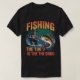 This black t-shirt features a dynamic illustration of a person fishing at night or in low light conditions, wearing a hat and face covering, and reeling in a large fish with red fins. Above the illustration, the word "FISHING" is displayed in a bold, orange and yellow gradient font. Below, the phrase "THE TUG IS THE DRUG" is written in a smaller, red font. The background shows dark water with subtle light reflections. This design humorously compares the excitement of a fish tugging on the line to the addictive nature of a drug.
