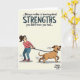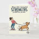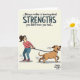 This card features a cream background with a line of dark text across the top that reads, “...Being a mother is learning about STRENGTHS you didn't know you had...,” with “STRENGTHS” set in all caps for emphasis. Under the message, a cartoon-style scene shows a woman with her hair tied back, leaning away as she grips a leash with both hands, her eyes wide and her mouth tense as if she’s fighting not to be pulled forward. Opposite her, a medium-brown dog lunges ahead with an open-mouthed grin and tongue out, as if thrilled by the chase and totally unaware of her struggle. Their push-and-pull feels like a familiar partnership, the kind where affection and patience live right alongside daily chaos ❤️. Small motion marks around their arms, legs, and the leash add a sense of speed, making the tug-of-war feel immediate and a little funny. The colors stay soft and cheerful, with warm browns, gentle neutrals, and simple shading that keeps the focus on their expressions. The leash stretches diagonally between them, and the dog’s tail arcs upward as the woman’s feet angle back for balance 🌼.