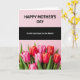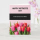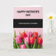 This greeting card is split into three horizontal sections, starting with a soft pastel pink field that sets a gentle, affectionate tone ❤️. Centered near the top, the words “HAPPY MOTHER’S DAY” appear in large black letters that stand out clearly against the pale background. Directly below, a solid black strip stretches across the card like a divider, creating a strong contrast. Inside that strip, “To the best Aunt in the World” is written in neat white lettering, reading like a close, caring note meant for someone special 👩. The bottom section shifts to an eye-level close-up of tulips packed tightly together, as if gathered for a warm embrace. Petals range from deep fuchsia and rosy pink to coral and orange-red, with green stems and long pointed leaves weaving through the blooms. The flowers fill the lower half of the design, with soft, even lighting that highlights the smooth petal edges and the layered shapes of the bouquet 🌼.