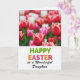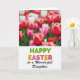 This greeting card features a two-part layout that pairs spring flowers with a friendly message. The top half shows a thick field of tulips in reds, pinks, and whites, with one standout bloom slightly off-center in the foreground. Its petals fade from deep crimson to bright white at the tips, and the sharp detail makes it feel like it’s leaning in close, as if sharing a quiet moment with the viewer 🌷. Behind it, the rest of the flowers soften into a gentle blur, creating a cozy, intimate backdrop like a stroll taken side by side. The light is diffused and calm, bringing out the petal textures without strong shadows. A crisp white panel fills the bottom portion, giving the eye a pause before the words. The main phrase appears in large green letters with orange‑fuchsia accents, and a smaller black cursive line sits beneath it, while a tiny 🐰 detail can be spotted near the lower text area.
