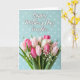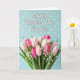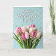 Designed with a large bouquet filling the lower part of the card, the scene focuses on tulips with mostly closed buds that look ready to open. Rich pinks and softer blush tones sit beside creamy white blooms, creating a gentle contrast that feels like a quiet gesture of affection ❤️. Small clusters of tiny white filler flowers weave through the green stems like little shared secrets between close friends. The background is a pastel aqua field with faint, out-of-focus white dots that give the space a soft, airy depth. Near the top, a short message appears in white lettering, centered and easy to spot against the cool background. The spacing leaves plenty of breathing room above the flowers, so the note feels like it’s floating over the bouquet 🌼. The lower edge is packed with layered stems and petals, while the upper area stays open with the pale aqua and scattered white dots.