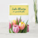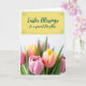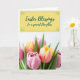 This design shows a spring-themed card front with a sunny yellow banner across the upper third, edged by a thin green doodle-like border with small corner accents. Centered inside the banner, the message “Easter Blessings to a special Daughter” appears in flowing dark lettering, standing out clearly against the yellow. Below the banner, a full bouquet of tulips fills most of the space, arranged close together like a thoughtful gift offered with quiet affection 🌷. The blooms mix soft rose-pinks and gentle butter-yellows, with several petals fading from one shade into the other for a tender, blushing look. Broad emerald-green leaves and sturdy stems weave between the flowers, adding contrast and a fresh garden feel. Soft, bright lighting highlights the petal textures and fine veins, while the nearest blossoms stay sharp and the background falls slightly out of focus 🐰. The background remains a smooth, pure white, making the yellow header and the pink-and-yellow tulips the main focus.