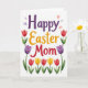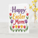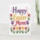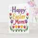 This design shows a spring-themed illustration with the words “Happy Easter Mom” placed in the center, surrounded by tulips and small hearts. “Happy” sits at the top in deep purple, “Easter” is larger beneath it in warm orange, and “Mom” appears below in a strong red, all in a loose hand-drawn lettering style. Around the greeting, tulips rise on both sides, with violet blooms leaning inward as if they’re gently guarding the message like close friends. Along the bottom edge, a neat row of tulips alternates red and golden-yellow petals above green stems, creating a garden-like base. Small lilac and pink hearts float near the upper words, adding a sweet, affectionate touch 🌷. The background is bright white, which makes the colors stand out without looking busy. Two purple tulips frame the center text while red and yellow tulips line the lower border, with tiny hearts scattered near “Happy” 🐰.