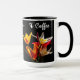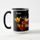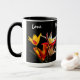 A bunch of colorful sunlit tulips of yellow, red, purple colors against the black background on both sides of the mug. Text: Love, Flowers, & Coffee along the top rim. Funny customizable coffee mug for anyone. You can change images and you can change or delete all the texts.