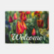 Welcome doormat featuring some beautiful red and yellow tulips in a flower garden. This was a photo I took in Springfield Missouri, United States and turned into a digital art painting which is also known as Mixed Media.