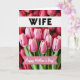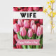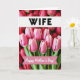 This card features a close-up photo of soft pink tulips opening in the foreground, their petals lit with gentle, diffused light that makes them look tender and fresh ❤️. Behind them, deeper red flowers blur into the background, creating a warm, cozy depth like a quiet moment shared between two people. Green stems and leaves peek through the pinks and reds, adding a calm, natural contrast. Across the upper third, a crisp white horizontal banner carries the word “WIFE” in bold black lettering, centered and easy to read. Lower down, a curved pink ribbon banner sweeps across the middle-lower area with “Happy Mother’s Day!” written in white, flowing lettering that feels affectionate and close. The mix of soft focus and rich color makes the bouquet feel like it’s leaning toward the viewer, like an offering held out with care 🌼. The final look is framed by the blurred red blooms behind the tulips, while the pink ribbon banner arcs gently across the lower-middle portion.