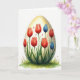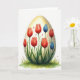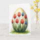 This design shows a watercolor-style scene with a large cream-colored egg shape centered on the front, softly shaded with a warm yellow glow near the top. From the egg and the green grass below, slender tulips rise upward like a small bouquet that feels shared between close friends 🌷. Seven main blossoms appear, mostly in red and orange, with two blue tulips tucked among them like a quiet, affectionate contrast. Tiny red speckles dot the egg’s surface, adding a light, confetti-like touch that suggests a gentle celebration 🐇. Near the upper portion of the egg, simple lettering sits neatly, with the greeting in a soft gray tone that doesn’t overpower the artwork. The background stays pale and airy, letting the greens and petals stand out while the brushy texture keeps everything soft and natural. At the base, layered green strokes form a grassy patch with small leaves and stems overlapping in loose, watercolor washes.
