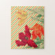 My original artwork is featured on this floral puzzle, consisting of a green and orange retro striped background and a vintage illustrated trio of tulips in orange, yellow and red. The size of this unique flower puzzle is 11” x 14”, and in the ‘challenging’ category, however you may size up or down as desired.