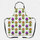 This apron has an art deco design made from diamonds, triangles, and polygons making tulips in orange and purple with green stems and leaves.