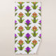 This towel set has an art deco design made from diamonds, triangles, and polygons making tulips in orange and purple with green stems and leaves.