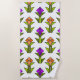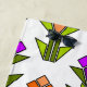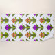 This beach towel has an art deco design made from diamonds, triangles, and polygons making tulips in orange and purple with green stems and leaves.