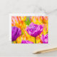 Colorful violet, purple, pink tulips on a flowerbed. Virtually all the rainbow colors present. Bright and positive floral scene. Macro photography.