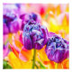 Colorful violet, purple, pink tulips on a flowerbed. Virtually all the rainbow colors present. Bright and positive floral scene. Macro photography.