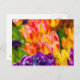 Colorful tulips on a flowerbed. Virtually all the rainbow colors present. Bright and positive floral scene. Macro photography.