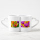 Colorful violet, purple, pink tulips on a flowerbed. Virtually all the rainbow colors present. Bright and positive floral scene. Beautiful couple coffee mug set.