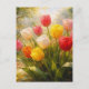 Artwork of tulips blooming in a forest in a painterly style. This radiant artwork captures a vibrant bouquet of tulips basking in the golden glow of early morning sunlight. The dappled light filters through the background trees, highlighting the delicate texture of the petals and the rich green of the leaves. The artwork features a variety of tulip colors including red, yellow, orange, white, and pink, set against a soft, sunlit forest background. The lighting is warm and golden, highlighting the textures of the petals and stems. It feels like a window into a perfect garden day, bringing a sense of warmth and cheer to any viewer. A wonderful gift for gardeners, nature lovers, or anyone who needs a daily reminder of sunshine in their lives.