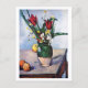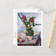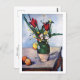 A fine art postcard with the painting by Paul Cézanne (1839-1906), titled, Tulips in a Vase (1892). A bouquet of deep red tulips in an olive jar against a blue background. Cézanne was a French Post-Impressionist artist.