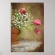 tulip bouquet and baby's breath bouquet in clay pot on old-fashioned lace doily with grungy texture overlay