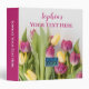 Personalize this 3 ring binder with your Name, Your Text (Title), Your Logo, Info and even replace tulip photos with Your Photos. Use for recipes, floral business, family photos or whatever. Extra text on back. Colors: green, yellow, pink and white.