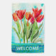 Welcome spring with this custom garden flag featuring a watercolor painting of red tulips on an aqua background with modern white typography on an aqua border with dots along the bottom edge. Personalize it with a name or word of your choice. Designed by © Tim Coffey.