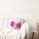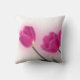This is a white throw pillow decorated with a photograph of several pink tulips.