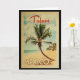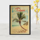 A uniquely retro mid-century modern Tulum Mexico art print in vintage travel poster style. It features a curved palm tree on sandy beach with ocean under a blue cloudy sky.