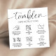 Minimalist Tumbler Care Instructions Card with black and white background, script fonts and handcrafted tumbler care icons. This editable tumbler washing guide includes the most important care information so your customers know how to care for rhinestone, personalized and decal tumblers and cups. Add your business details and logo, change the colors and make this care card your own.