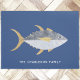 Fun Tuna fish with a cheeky smile, on a nautical navy blue background. Original art by Nic Squirrell. Change the family name or text to personalize.