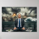 A man in a suit, sitting on a bench with headphones, seems tranquil despite the apocalyptic scene behind him. The background depicts protests and natural disasters, highlighting world chaos.
