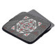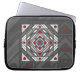 A concentric square mandala takes on the appearance of a tunnel that draws the viewer in with a combination of angled lines, triangles, and circles in shades of gray, red, and white to almost create an optical illusion.