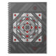 A concentric square mandala takes on the appearance of a tunnel that draws the viewer in with a combination of angled lines, triangles, and circles in shades of gray, red, and white to almost create an optical illusion.