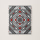A concentric square mandala takes on the appearance of a tunnel that draws the viewer in with a combination of angled lines, triangles, and circles in shades of gray, red, and white to almost create an optical illusion.