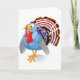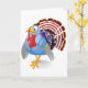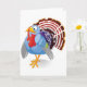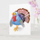A turkey standing proud. This is a very colorful cartoon style turkey. It has an amusing expression on its face and is showing all its feathers and colors. This turkey design looks great on these greeting cards