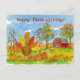 A cute holiday Happy Thanksgiving postcard decorated with a whimsical turkey with colorful feathers in the pumpkin patch with a red barn and autumn trees drawn in pen and ink with watercolor.
