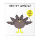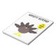This awesome notepad features a funny cartoon of a turkey with big black eyes, a small yellow beak and tail feathers sticking up. The feet are facing in opposite directions making the turkey look clumsy. The turkey is holding a yellow balloon with a message inside that says “it’s turkey time”. This is a fun thanksgiving party design. There is customizable text at the top of the notepad allowing you to personalize it for yourself or turn it into a lovely gift for someone else.