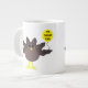 This awesome mug features a funny cartoon of a turkey with big black eyes, a small yellow beak and tail feathers sticking up. The feet are facing in opposite directions making the turkey look clumsy. The turkey is holding a yellow balloon with a message inside that says “it’s turkey time”. This is a fun thanksgiving party design.