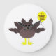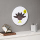 This awesome clock features a funny cartoon of a turkey with big black eyes, a small yellow beak and tail feathers sticking up. The feet are facing in opposite directions making the turkey look clumsy. The turkey is holding a yellow balloon with a message inside that says “it’s turkey time”. This is a fun thanksgiving party design.