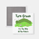 A cute little green caterpillar on green grass with a great environmental message. "Turn Green', It's the Way of the Future."