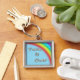 Key Chain with words -Turn It Over on blue sky with rainbow and silver color frame You can customize and add your own text It is artistically created.