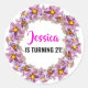 Turning 21 pink and lilac round sticker. 21st birthday party stickers. "Jessica is Turning 21" is completely customizable. You can change the name and age. Choose the colors and fonts you like from the edit menu. Use on your party invitations to completely personalize the party with this tropical theme.