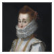 A woman adorned in a sumptuous Elizabethan dress gazes out, her ruff is exaggerated to express the affect fashion has on young girls. The intricate gown suggesting a high status. Her red hair is elegantly coiffed, complementing the rich fabrics and ornamental details of her attire.