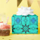 This striking wrapping paper features a bold turquoise and blue kaleidoscope fractal pattern arranged in a seamless geometric repeat. Intricate symmetrical shapes and layered textures create a dramatic design that blends abstract symmetry, psychedelic color, and modern digital art into a vibrant decorative pattern.