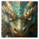 A tile with a cool close up illustration of a turquoise and metallic gold dragon face with realistic eyes. Fantasy art realism dragon art.