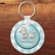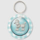 Cute poodle key chain done in a turquoise and white gingham pattern. Graphics of a large turquoise button, in the middle, has adorable graphics of a fluffy white poodle, and white custom text. Personalize the text to read what ever you want. Makes a great gift idea.