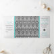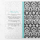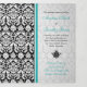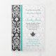 Elegant vintage turquoise, black and white damask floral pattern tri-fold wedding program with personalized photo template. Elegant tri-fold wedding program design that features a beautiful black and white damask pattern with turquoise accents. You can personalize all the wording and the engagement or couple photo on the inside panel. This program has lots of room to add additional wording as well. You may have to go into the customize section to change the placement of the wording or the font sizes. There are layers for each of the different panels.