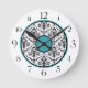 Elegant wall clock with a black & white damask pattern accented with turquoise. The numbers are in a fancy size varying pattern to break up the typically uniformity that most clocks display.