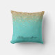 Turquoise Blue and Gold Confetti Glitter Sparkle Monogrammed Girly Pillow. The Monogram "add your own name" Aqua Blue Pillow uses faux sparkly glitter.