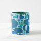 A stylish white coffee mug with a green lip and handle and an abstract turquoise, sea green, deep blue and white pattern, from a silkscreen print by Judy Adamson.