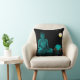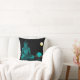 Throw pillow with turquoise Buddha on the front against a black background and a turquoise print pattern on the back.