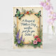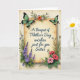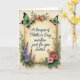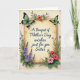 This card features a sepia-toned scroll at the center with a lightly weathered parchment texture, giving the scene a gentle, keepsake feel. Across the scroll, flowing deep-blue lettering reads, “A Bouquet of Mother’s Day wishes just for you Sister,” with the words centered and sized to fill most of the open space. A pair of turquoise-green butterflies with dark outlines rest near the upper corners, angled inward as if drawn together in a tender, shared moment ❤️. Around the scroll, leafy stems and small accents curl in close, like a soft embrace that suggests closeness and care. On the left side, layered lavender and soft blue blossoms rise upward with slender green stems, creating a cool, calming balance. On the right, coral-pink and deep red flowers bloom outward through rich green foliage, adding a warm counterpoint 🌼. The lighting stays soft and diffused, with gentle shading that makes the petals and wings look delicately detailed against the aged-paper background. Two turquoise-green butterflies sit near the top corners above the blue text, while purple-blue flowers cluster along the left edge and coral-red blooms spread along the right.